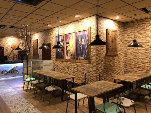 Los pavimentos cerámicos imitación madera aportan un carácter hogareño, mientras se añaden mosaicos hidráulicos en zonas estratégicas para la fluidez de cliente.